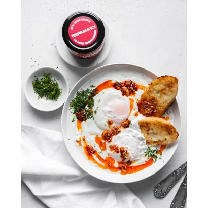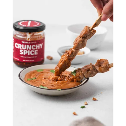 Trouble & Spice Crunchy Spice – Crispy Chilli Oil is een knapperige chili-olie op Chinese wijze. Doordrenkt met Sichuan peperkorrels, kaneel, steranijs en andere kruiden. De olie wordt gemengd met chilivlokken, sesamzaad, pinda’s, knapperige uien en knoflook. Deze crispy chilli oil is heel veelzijdig. Gebruik de olie om je eieren te bakken en top ze af met de knapperige stukjes of gebruik het bij je favo wokgerechten. Dit spul is verslavend!
